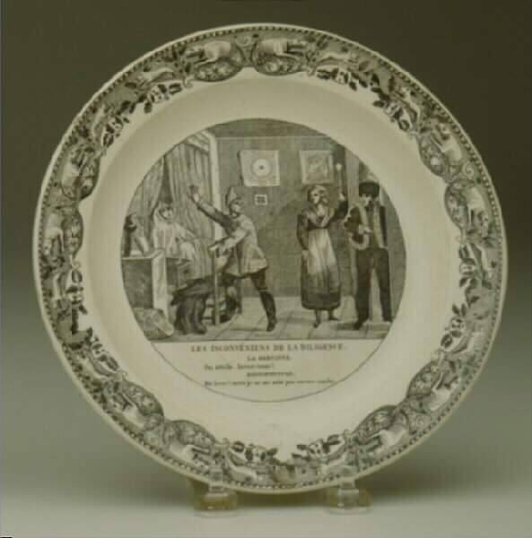 DescriptionTransfer printed in black with scenes from plays (possibly opera): "La Dame Blanche", "Les Inconveniences de la Diligence", "Le Hussard de Felsheim", "Joconde" with animal and foliage decoration on the brim.