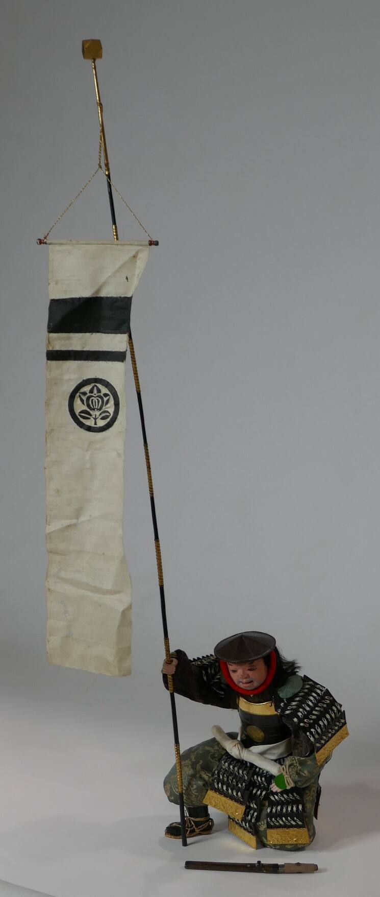 DescriptionThis doll portrays a bannerman holding a banner in his right hand. He wears a flat helmet with a red cord, lacquered paper armor with metal bosses, silk lacing, and a thick belt covered with plain white silk. he wears His face is round and painted with pigmented gofun. The white banner is attached to a long pole with a square fitting at the top. The banner has a think black horizontal line above a thin black horizontal line, under which depicted an encircled orange (tachibana) motif.