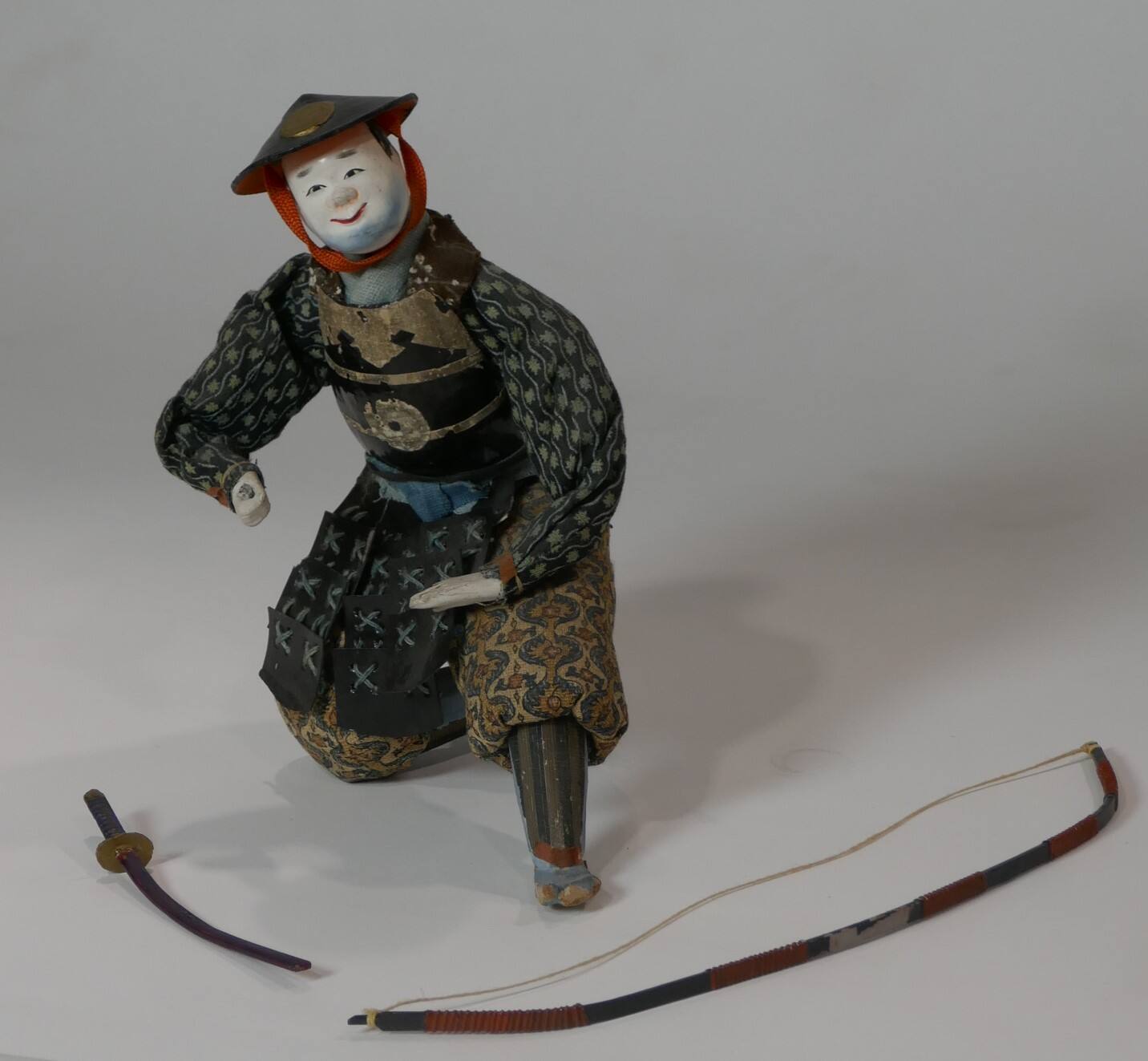 DescriptionThis doll portrays a bannerman ready to hold a banner in his right hand. He wears a flat, lacquered helmet with a circular motif and a red cord, lacquered paper armor with silk lacing, and a pair of bulky pants made of printed fabric. His face is round and painted with white gofun. He has a bow and a sword.