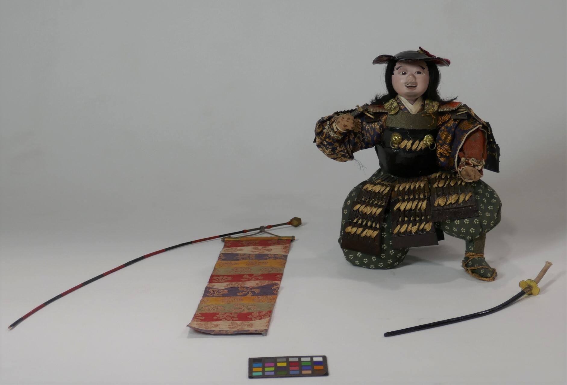 DescriptionThis doll portrays a bannerman holding a five-colored banner made of brocaded silk in his right hand. He kneels on his right knee and holds his right arm up to hold the banner. His hair is not tied, and he wears a flat helmet. He wears a suit of armor with black-lacquered breast and back panels and transparent-lacquered plates joined by beige lacings. His robe is made of dark blue silk with ochre-colored silk brocade. His pants and socks are moss-green cottons with white cherry blossom patterns. He wears a pair of straw sandals (waraji). He has a long, thin sword, which may not belong to him originally.