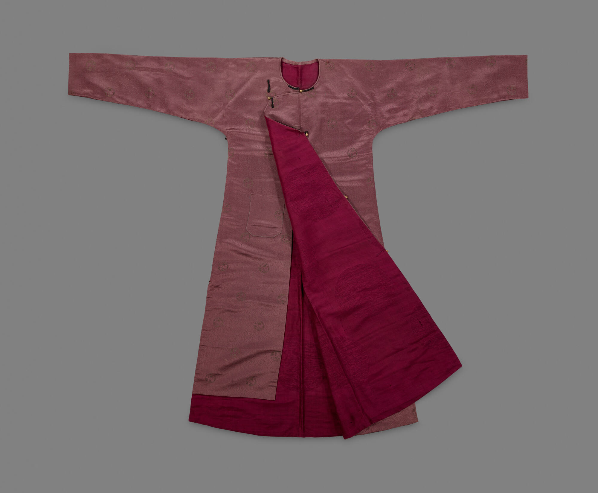 DescriptionDark mauve colored silk robe in the casual Manchu style. It has a round collar, and side flap fastened with five pairs of black loop and metal buttons. The silk fabric is woven with the patterns of small roundels in petal-patterned ground. The garment is lined with plum colored silk with roundel patterns.ProvenanceWith Laurence Sickman (1898-1989), about 1930s-1973;