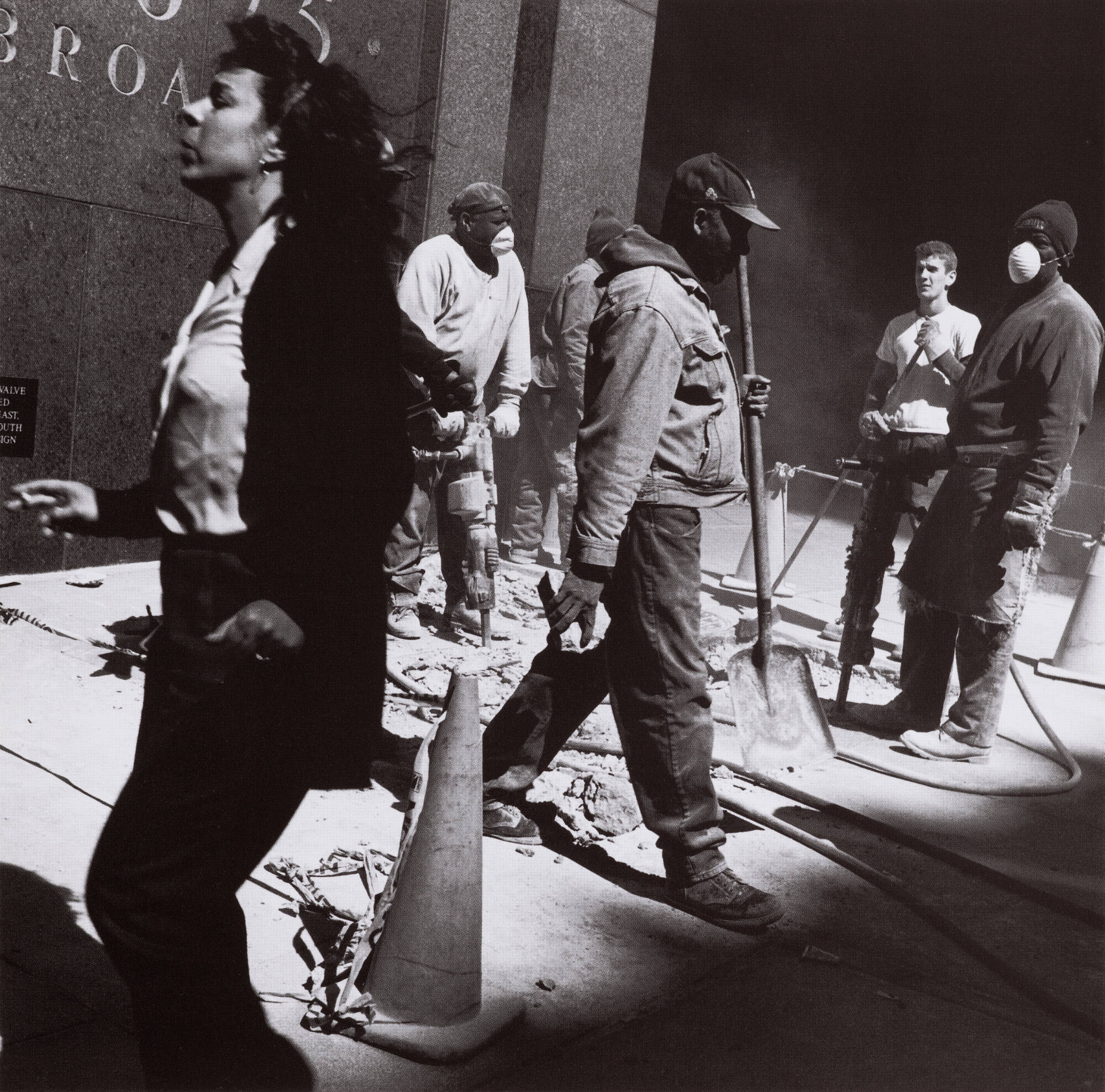 DescriptionImage of construction workers holding hand tools and a jackhammer as they work on a sidewalk. A woman in profile walks through the scene along the left edge of the frame.ProvenanceLouis Stettner;