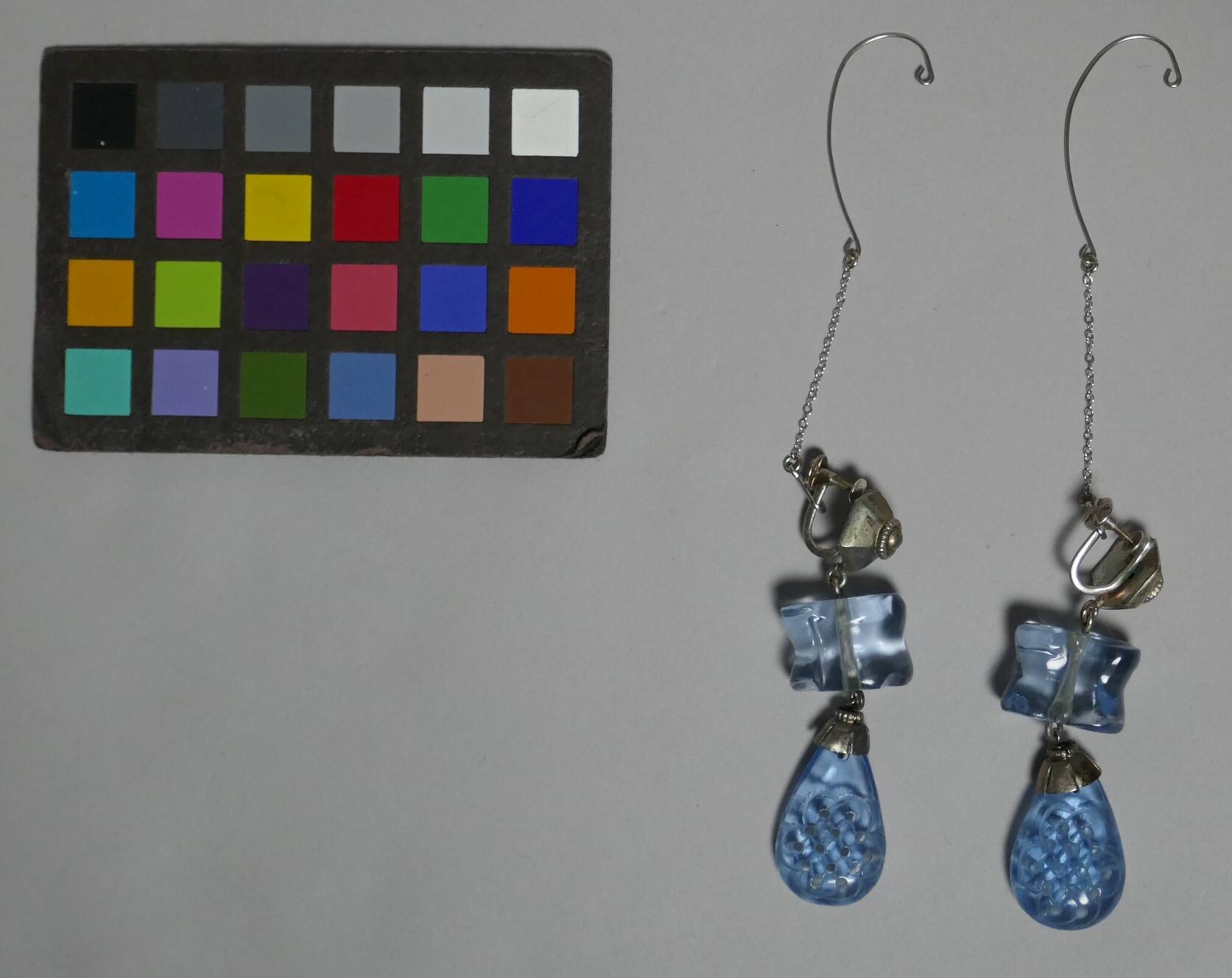 DescriptionEarrings with metal fittings and carved glass beads in translucent pale blue.Provenance