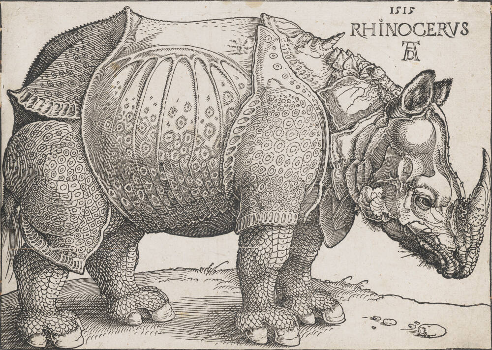 Gallery LabelAlbrecht Dürer, the most famous German artist of all time, worked during the Renaissance period of the early 16th century. He never saw the rhinoceros represented here but relied on a written description and a drawing by another artist. Thus the animal looks more like a knight in armor than the real thing.