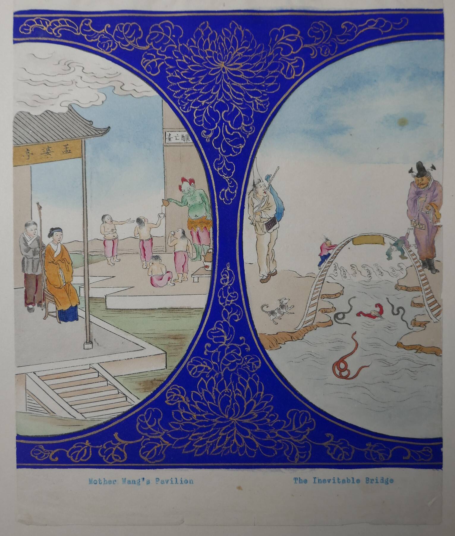 DescriptionThe painting in ink, color, and gold, features a two partially rounded scenes of twelve total figures, snakes and a dog framed by the painted border of floral pattern in gold on blue ground. It is a leaf from the album of 40 leaves depicting the popular story of Journey to the West (Xiyouji). Below the painting is a brief typescript caption in English, possibly added by James Ware.ProvenanceJames Ware (1859-1913)