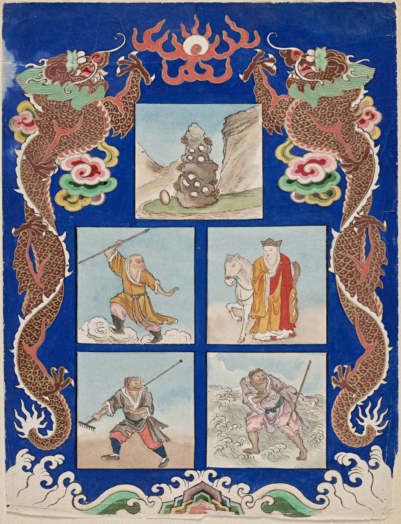 DescriptionThe painting in ink, color, and gold, features five square scenes. The scenes are framed by a painted border of two dragons on blue ground. It is a leaf from the album of 40 leaves depicting the popular story of Journey to the West (Xiyouji).Exhibition HistorySages and Heroes: Storytelling in Asian Art, The Nelson-Atkins Museum of Art, Kansas City, MO, April 12, 2025–November 30, 2025, no cat.