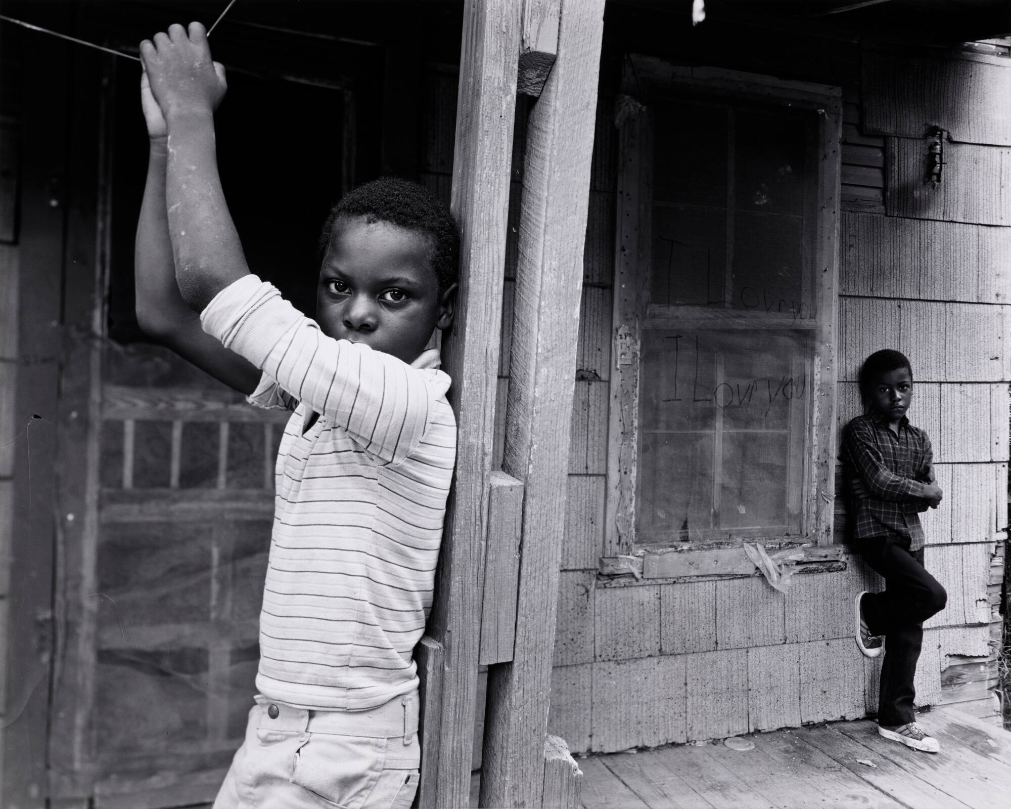 Two young boys stand on a weathered porch, looking directly into the camera. The phrase “I lovr you” appears on the dusty window screen. Their poses look casual and relaxed, even as they both stare directly into the camera lens.