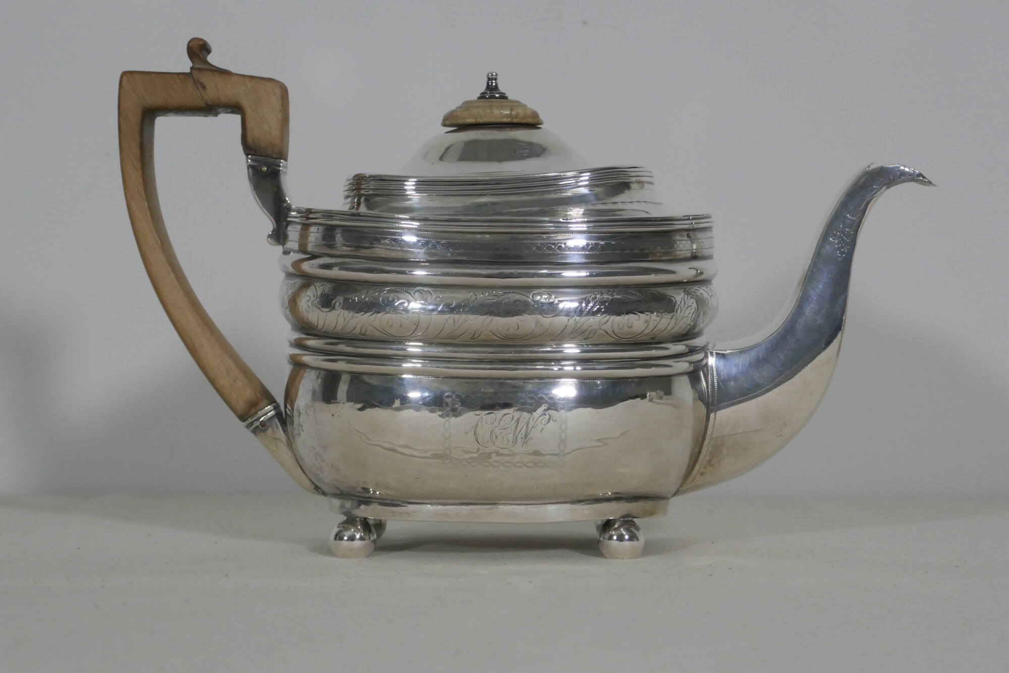 InscribedOn side of teapot, monogram "C E W"