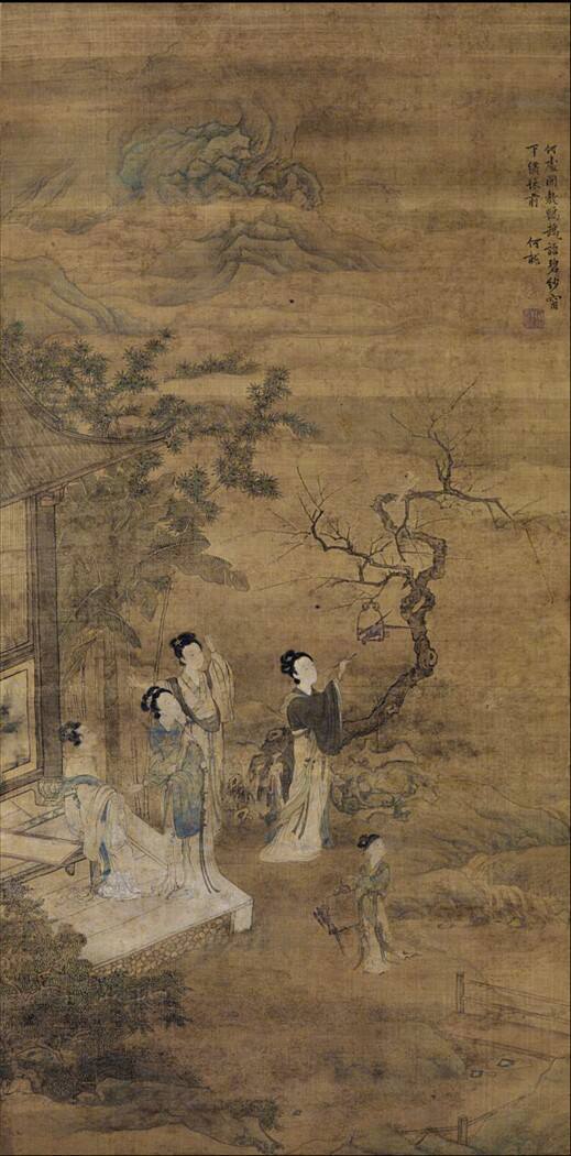 DescriptionThe composition of this painting is diagonally distributed into two halves, with the group of figures placed in the lower left half. The scene centers from a woman raising a whisk’s end to stimulate a red parrot perching on a bird stand. Three other women and a young girl casually watch, waiting to see how the bird would interact. More parrots rest on the tree branch or on the stand held by the girl. The ladies held their teaching in a scenic view featuring a pavilion near a creek and distant mountains floating in the mists. The inscription appears on the top right. This painting is paired with another “Playing Chess in an Elegant Garden,” by the same artist. The pair correspond to each other in the positions of motifs and inscriptions.Published References
