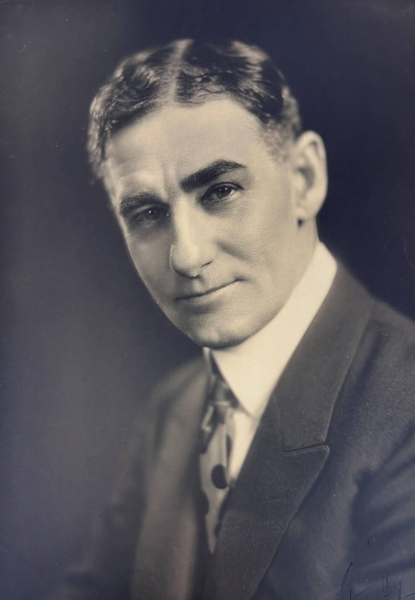 DescriptionPortrait of a man in three-quarter profile wearing a suit jacket and polka-dot tie.