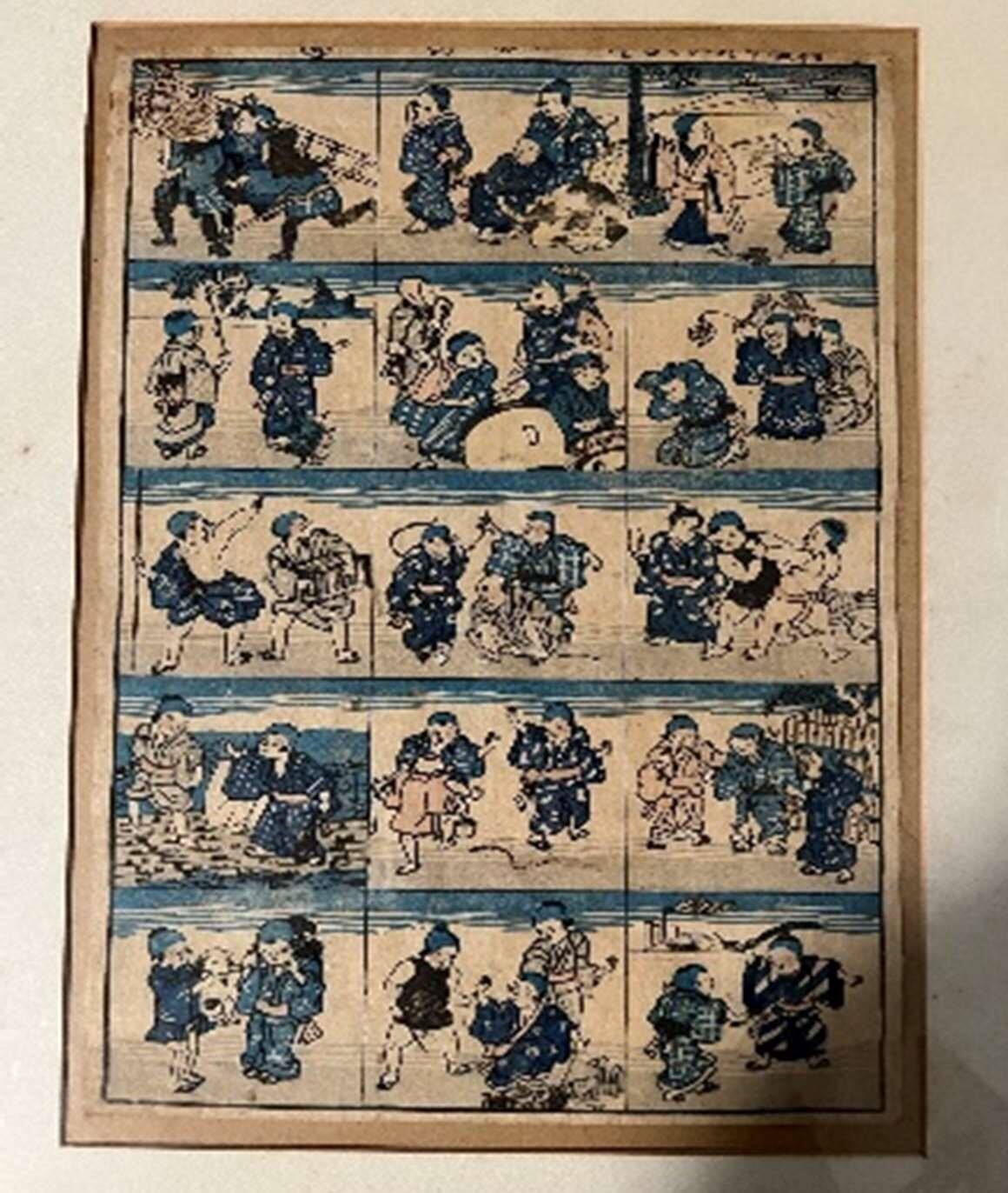 DescriptionThis is a polychrome ōban woodblock print. It depicts fifteen scenes of children at play. The scenes are depicted in a chart-like composition consisting of five registers, and each row has three scenes. Each scene includes two to four children, most of whom appear to be boys because of the shaved heads. From the top right to the bottom left, depicted plays include flying kites, pretending to be fire workers, scaring a friend with a ghost mask, sumō wrestling, catching insects, sword fighting with iris leaves, and caring for puppies.