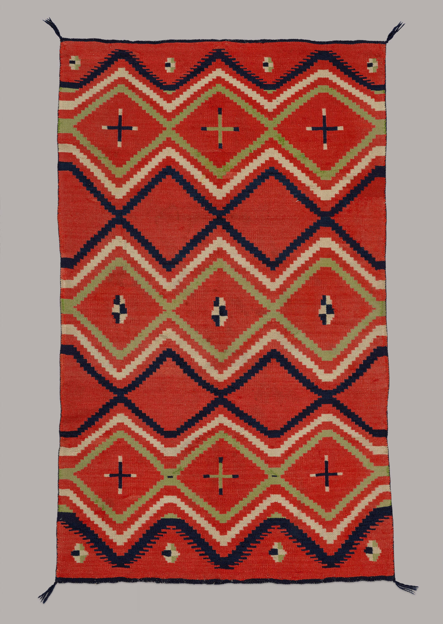 DescriptionWoven blanket with red background covered in serrated diamonds, crosses and other geometric designs.ProvenanceSusan De Jong, Santa Fe, New Mexico;