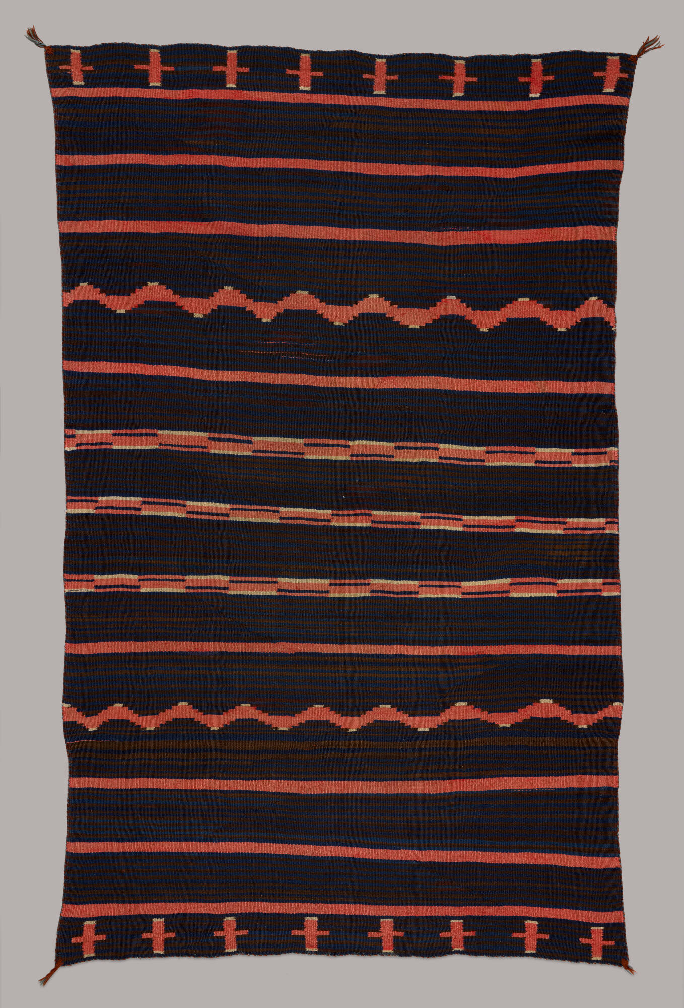 DescriptionWoven blanket in the "Moki" style, characterized by a backgroud of crosses, lines and serrated, zigzag lines on a dark ground.ProvenanceFred Harvey Collection, Indian Department, Albuquerque, New Mexico;