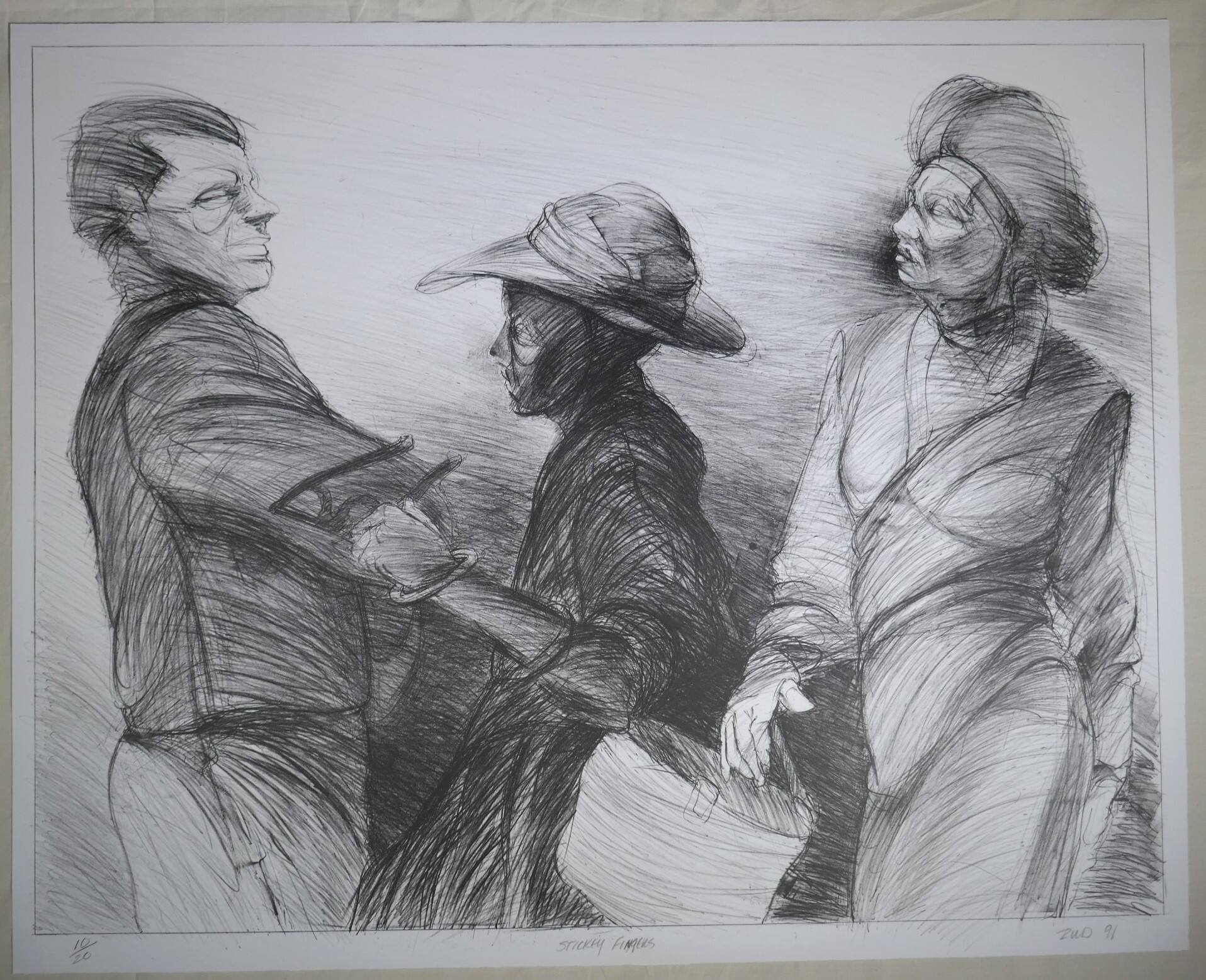 DescriptionThree figures in black and grey. A White man seen in profile gives a stern look toward an Asian(?) woman on the right. The woman, seen in three-quarter view facing left, is dipping her fingers into an open purse or basket slung over the shoulder of a Black woman in the center. The Black woman wears a hat with a wide brim and is seen in profile. Her proper left arm is bent and her hand blends with the man’s sleeve.Provenance