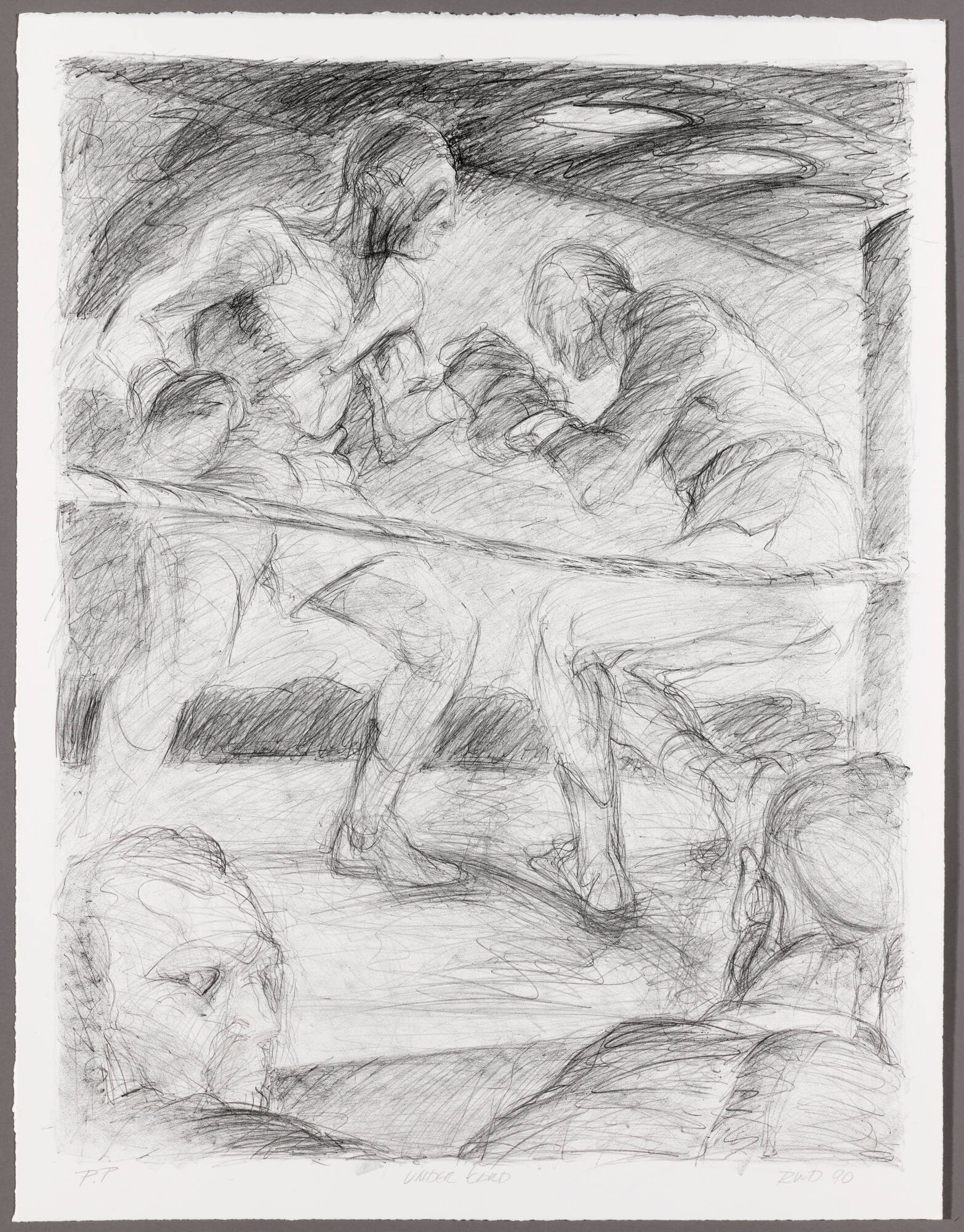 DescriptionTwo boxers in the upper two-thirds of the image. They stand behind the rope of the ring. The one on the left is seen with body in three-quarter view and head in profile; he faces right. He steps forward with his proper left leg; his left fist connects with the other boxer’s fists; his proper right hand is drawn back, preparing to punch. Both boxers wears shorts, gloves, a boxing helmet, and boxing boots. The boxer on the right faces left, his head and body seen in profile. His body is bent forward and his proper left arm connects with the other boxer’s glove. His knees are bent and the right foot is lifted to step back. In the foreground, two heads; the one on the left turns to our right, facing away from the ring. The one on the right is seen from behind.Provenance