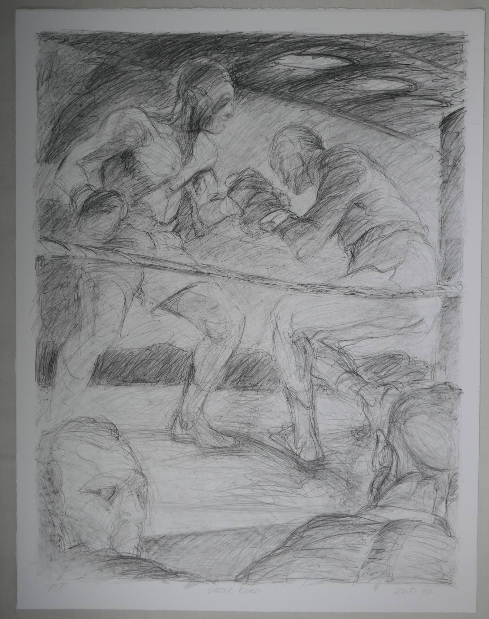 DescriptionTwo boxers in the upper two-thirds of the image. They stand behind the rope of the ring. The one on the left is seen with body in three-quarter view and head in profile; he faces right. He steps forward with his proper left leg; his left fist connects with the other boxer’s fists; his proper right hand is drawn back, preparing to punch. Both boxers wears shorts, gloves, a boxing helmet, and boxing boots. The boxer on the right faces left, his head and body seen in profile. His body is bent forward and his proper left arm connects with the other boxer’s glove. His knees are bent and the right foot is lifted to step back. In the foreground, two heads; the one on the left turns to our right, facing away from the ring. The one on the right is seen from behind.Provenance