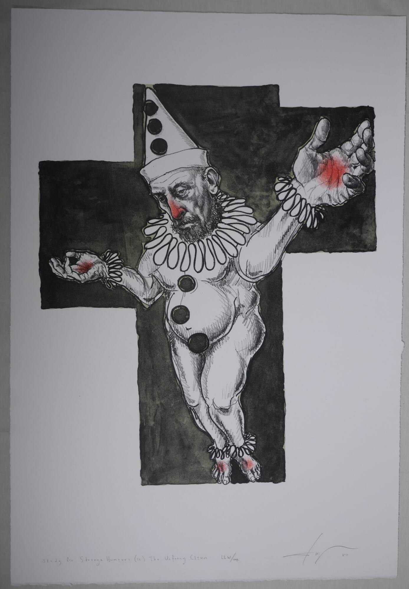 DescriptionA man in a white clown suit is nailed to an irregular Cross. Both hands have red palms where the nails were hammered, and his feet are nailed. He has three black pompoms on his white conical hat and on his pot belly, and ruffles around his neck, wrists, and ankles. His face is old with a black beard and a red nose.Provenance