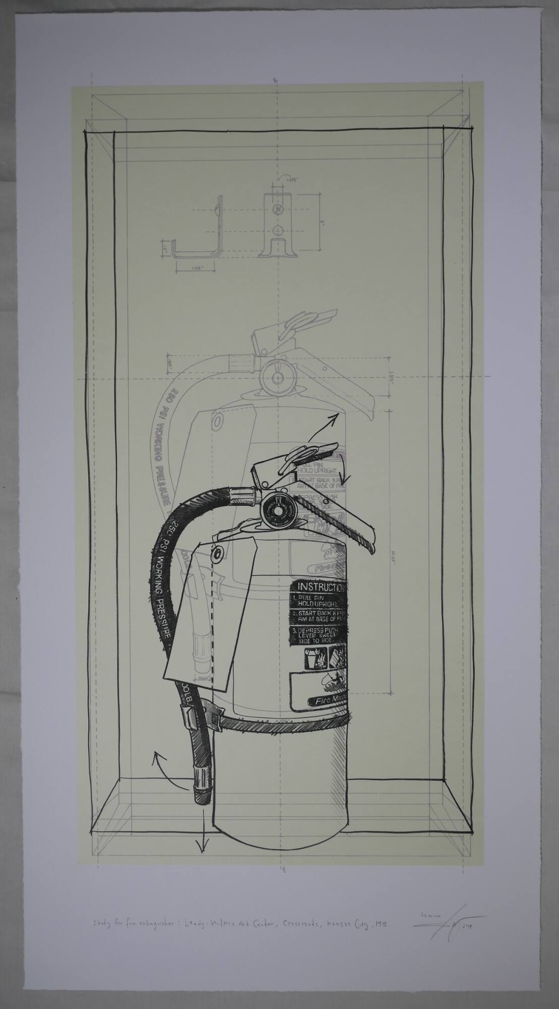 DescriptionBlack pencil sketch of a fire extinguisher in a wall recess. The handle is on the top right and the hose hangs to the left, as does a paper tag.Provenance