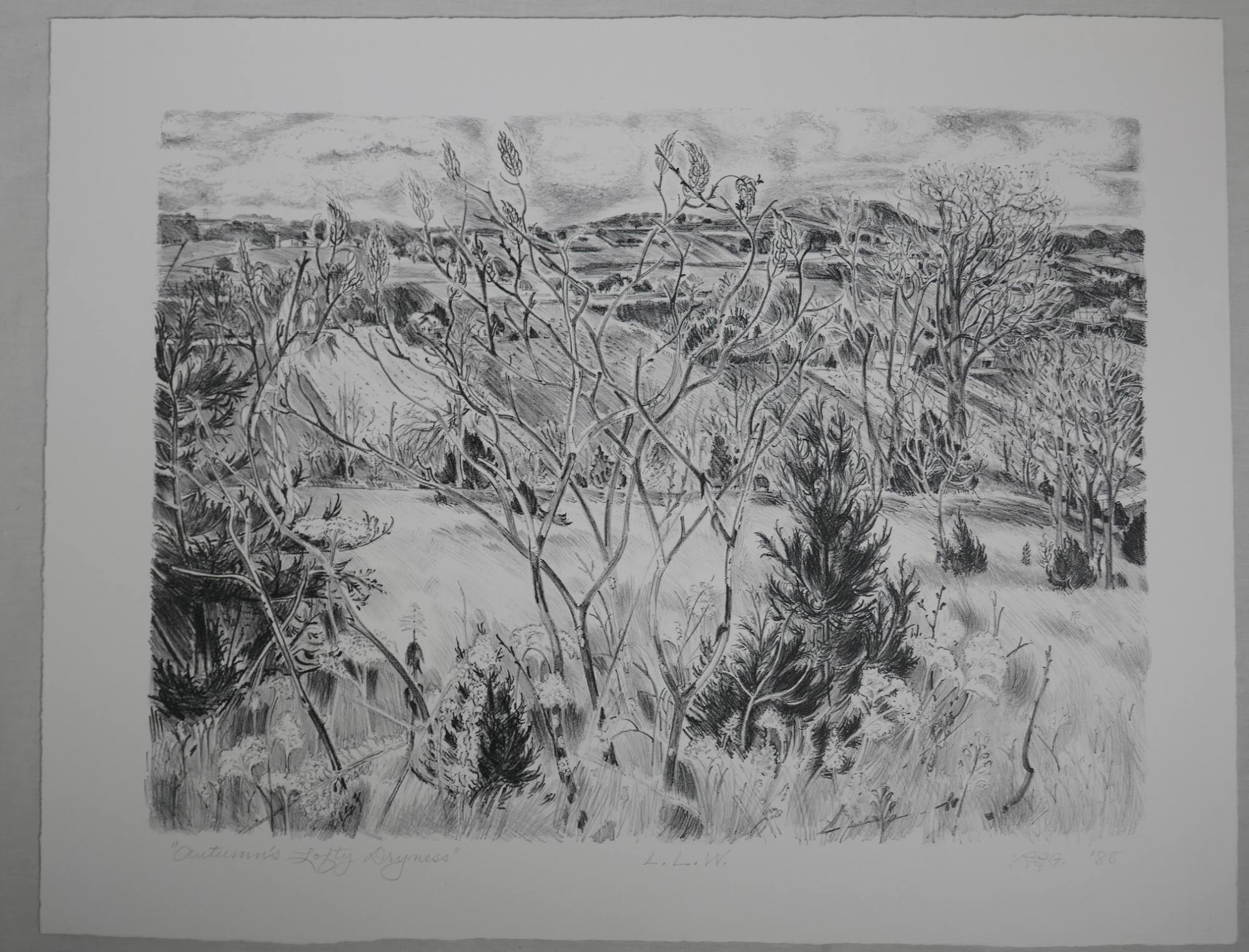 DescriptionBlack and white print of trees with bare branches in the foreground, as well as a short pine. Fields beyond. A road or stream starts in the middle of the right edge and moves diagonally to the background.Provenance