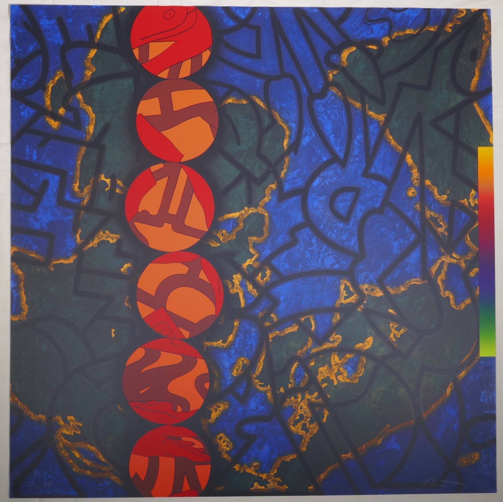 DescriptionA stack of balls combining pale orange, red and brown shapes to the left of center, set against dark green shapes outlined in gold, set in turn against a blue background. The background and green shapes are intersected with black lines. A blue paintbrush facing down is visible at the top of the print; to its left, what appears to be a pendant on a wide ribbon. Below the tip of the paintbrush, an upside-down R that is perhaps held in a blue fist. At the right edge of the print, a color scale.Provenance