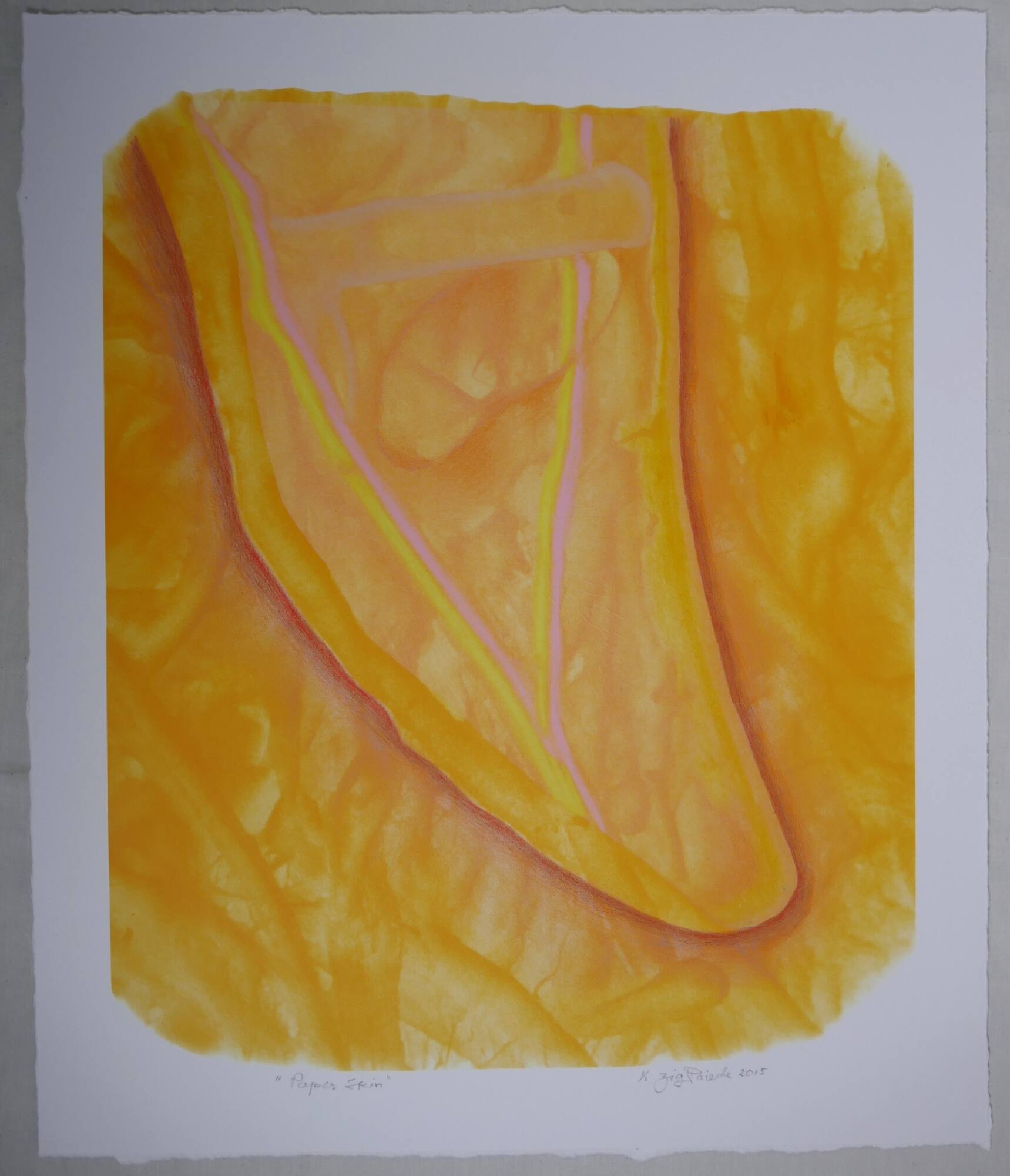 DescriptionThis monotype shows a roughly rectangular shape filled in with pale yellow applied in streaks and rubs. A “tongue” of deeper yellow streaks and rubs, outlined in deep red, is superimposed on the rectangle. Within the tongue, a triangle outline in pale periwinkle.Provenance