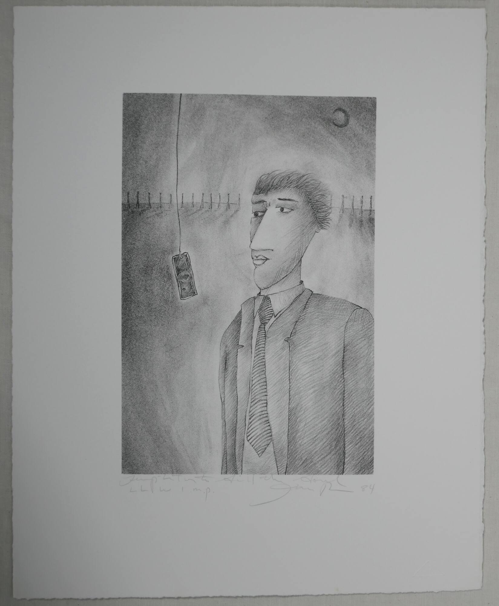 DescriptionA man in a jacket and tie, facing three-quarters left, stares at a dollar bill dangled on a string or wire. A hill with fence posts is behind him.Provenance