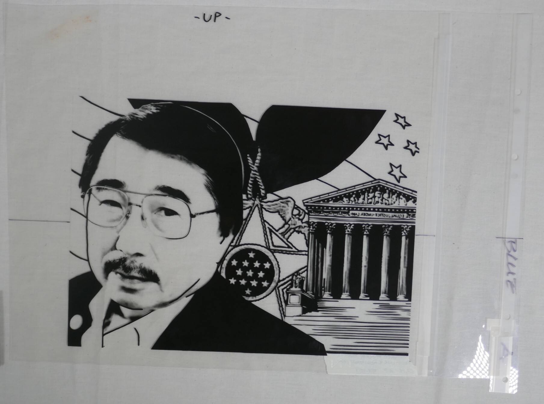 DescriptionThis key mylar for "Gordon Hirabayashi: American Patriot" depicts in the right foreground, the head and shoulders of an Asian man wearing glasses, with black hair and mustache, black jacket, white shirt, blue tie. At left, the Supreme Court Building, Background, an American flag. Military medals hang between the man and the building.Provenance
