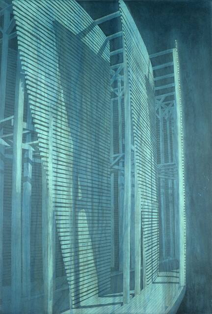 DescriptionA view of a Stackhouse sculpture:  vertical construction of thin-slatted sections fitted over upright posts joined by horizontal beams, some reinforced by diagonal braces, all rising from flat curved platform below.  Center, shadow formed on plane by middle slatted section, itself partly shaded by front plane, right, seen edgewise.Copyright© Robert Stackhouse