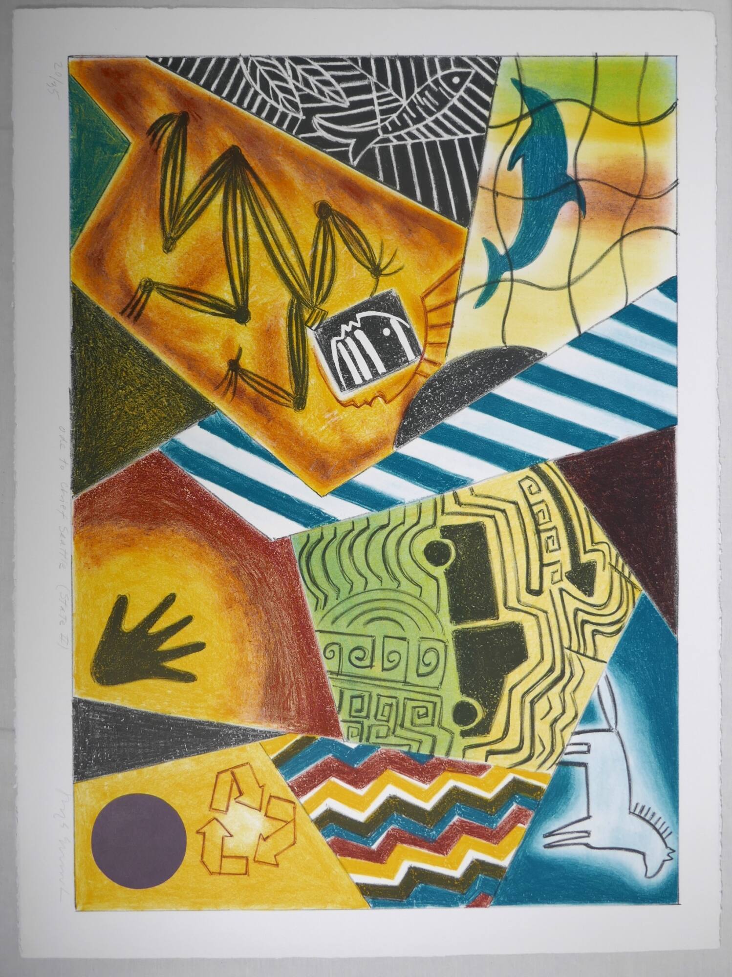 DescriptionThis five-color lithograph has a collage-like layout and is separated into multiple sections by crisp polygons, or geometric shapes. The upper left corner shows a blue silhouette of a dolphin-like figure on a background of green, yellow and orange, beneath curvy black grid lines. The next six-sided, concave polygon to the upper right shows a pattern of blue and white diagonal stripes. The shape flows down to the center of the composition. To the lower right of the dolphin polygon is a portion of a gray circle. In the top center is a dark triangle shape with hints of red. The upper right corner is a four-sided polygon depicting a simple drawing of a white horse, outlined in black atop a blue background. Beneath that shape to the right is a five-sided polygon vertically aligned chevrons or zig-zags that are in a repeating color pattern of yellow, black, blue, and red with a little white peeking through. To the left, toward the center is a five-sided polygon with a black silhouette of a pick-up truck on a yellow and green background. Black lines radiate from the truck in all directions, an arrow appears in the top left corner of the polygon and point to the right, and to the bottom right of the same polygon are abstract lines in semicircles and swirls. To the left, the polygon with the blue and white diagonal stripes and the portion of a gray circle peek down from the top. To the left of those shapes is a seven-sided polygon with a black stick-figure in a crouched position on an orange, yellow and red background. The face of the figure is outlined in red, but has a black and white square element on that has the same profile as the red outline but faces the opposite direction. The polygon on the left edge of the center of the print has three-sides and is a black background with white outlines of a fish and leaves and interchanging horizontal, vertical and diagonal lines beneath. On the bottom edge of the print are three triangles – they grow taller from left to right and are blue, gray with a yellow undertone, and black. To the left of the black triangle is a six-sided polygon with a black silhouette of a hand on top of a circular halo of yellow that radiates out to a red background. In the lower right corner is a four-sided polygon that has a purple circle on a yellow background which sits beneath three “folded” arrows that form a triangle and point in a counter-clockwise motion that are the symbol for recycling. There is a faint white circle in the center of the arrow triangle.Provenance