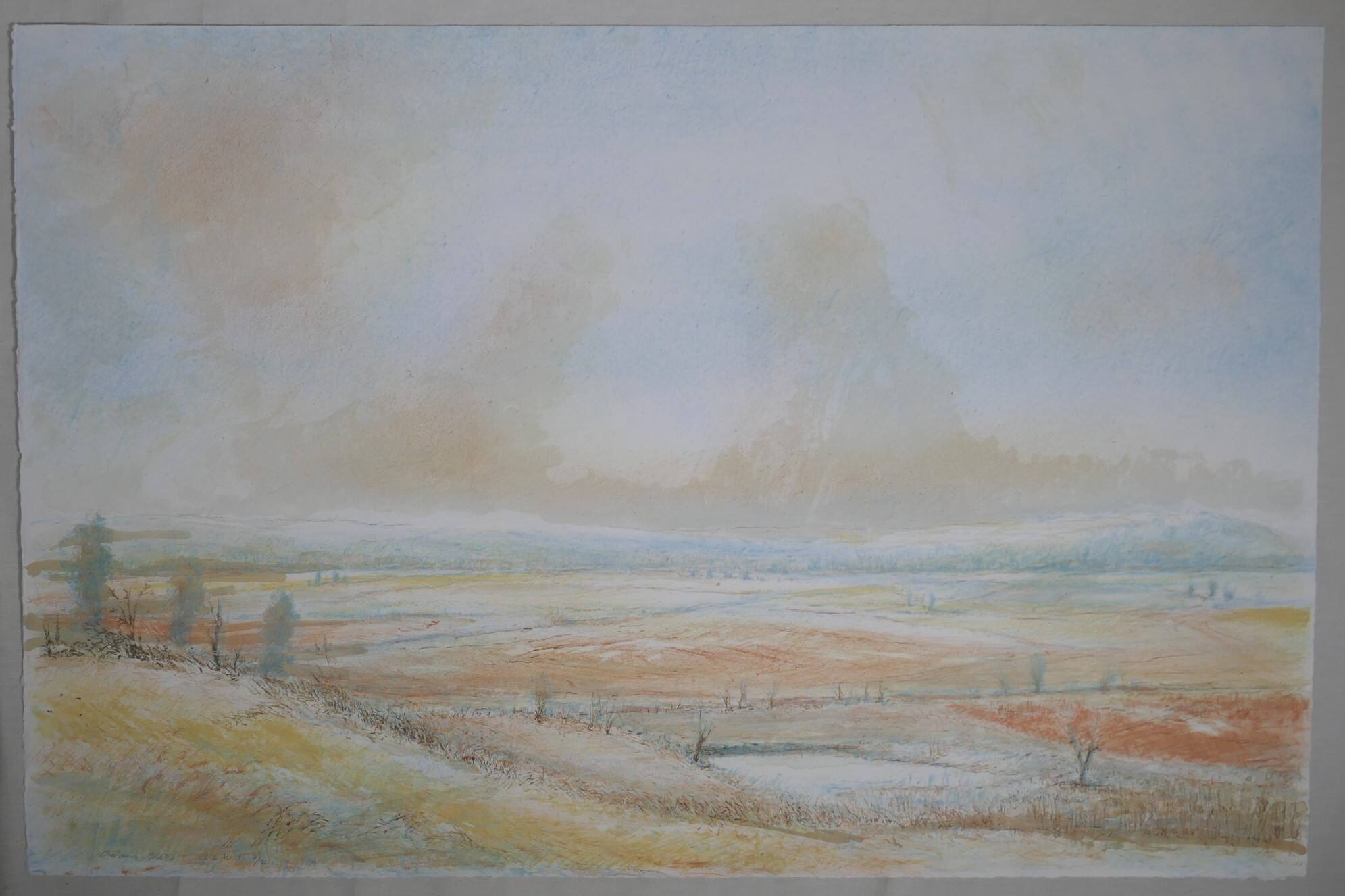 DescriptionThis lithograph is a pale landscape of hills, trees, and a small creek. The sun is either rising or setting which casts shades of orange on the fields and the mounting in the background in a blue-gray shadow.Provenance