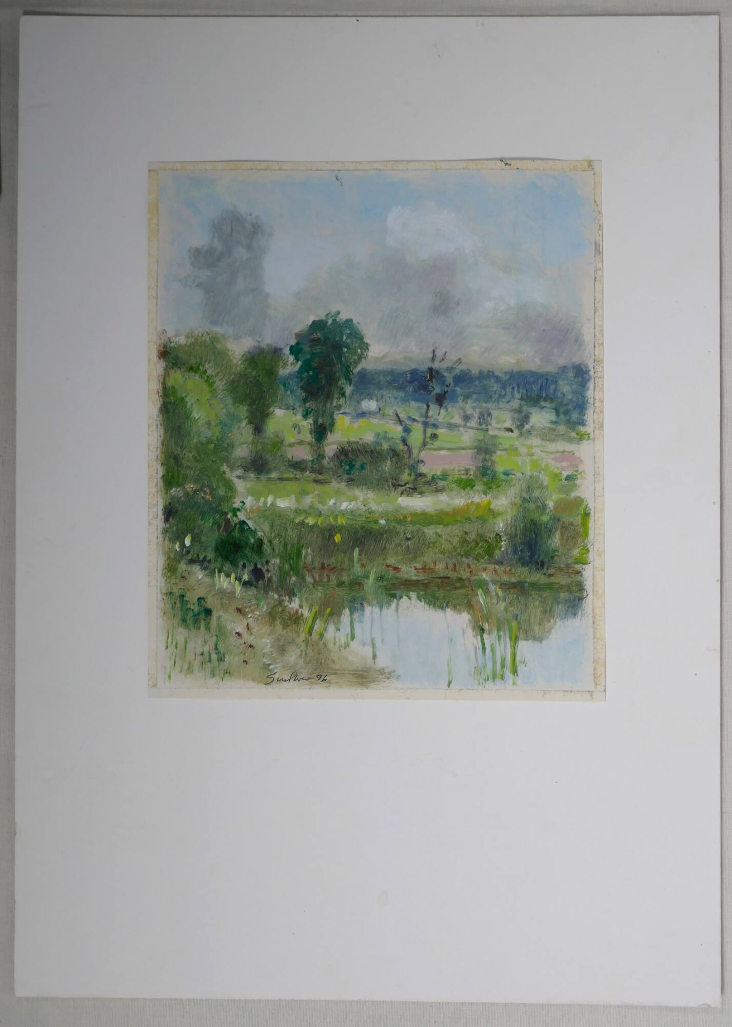 DescriptionThis small oil sketch on paper depicts a landscape of a cloudy day with trees, fields, and a small pond.Provenance