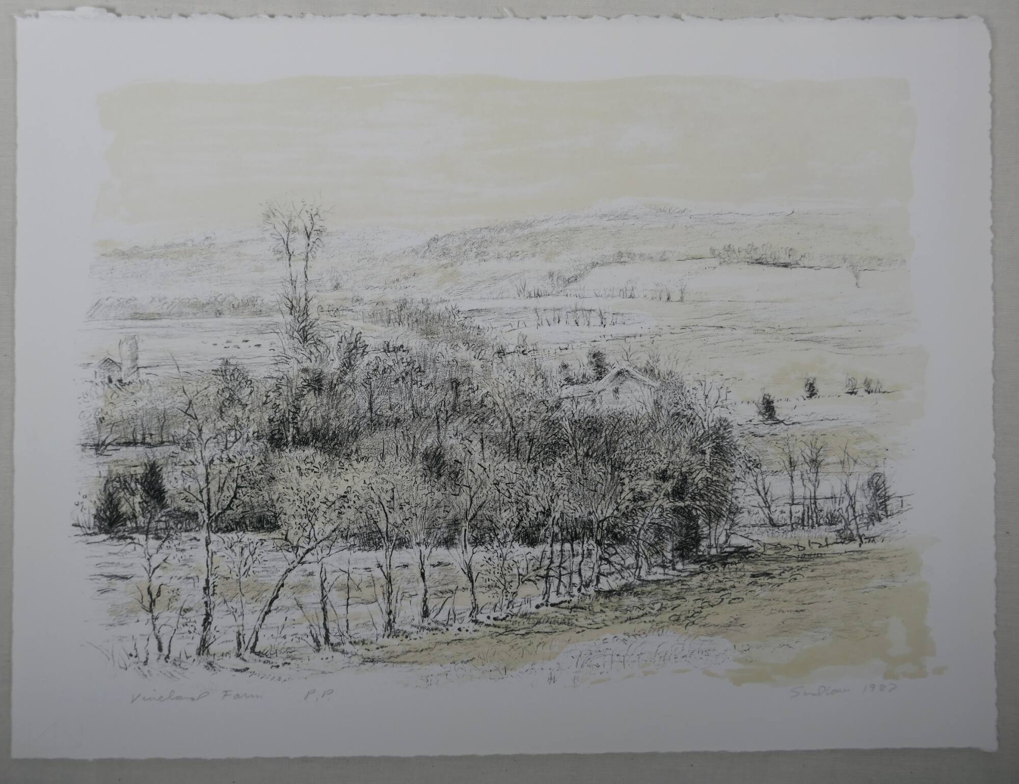 DescriptionThis lithograph depicts a farmhouse hidden behind rows of trees. The roads and sky are shades of beige.Provenance
