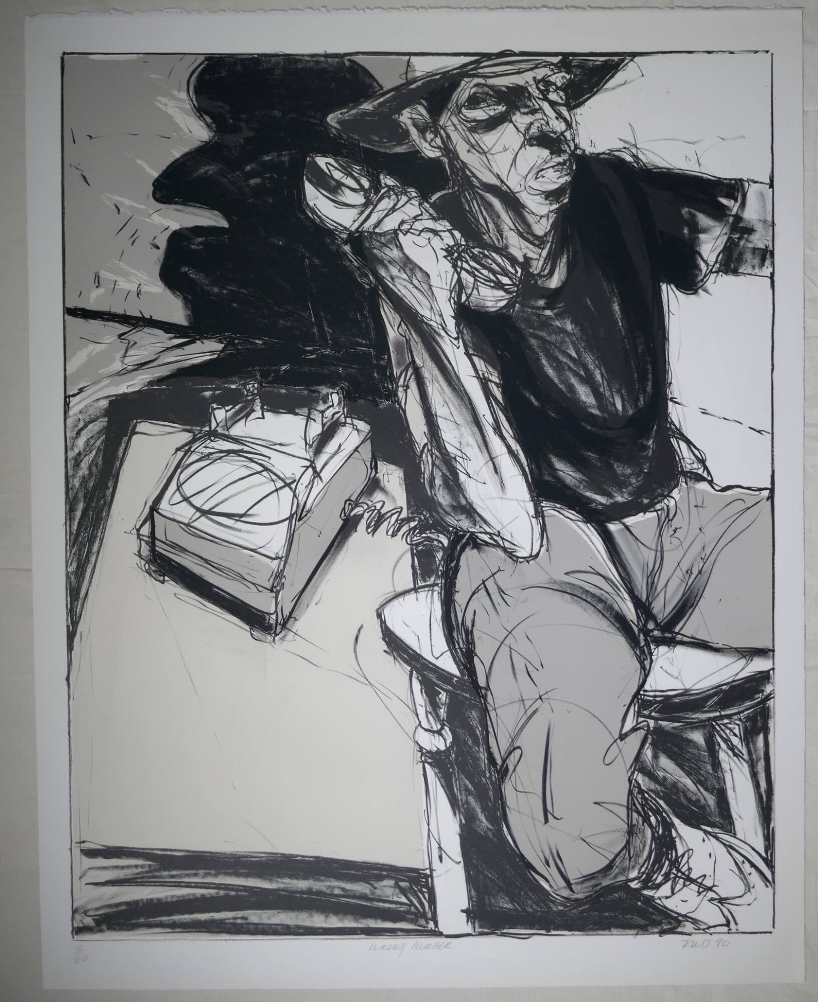 DescriptionThis lithograph shows a man sitting on a barstool holding a telephone receiver. The base of the phone sits on a table to his left. A heavy shadow of the man’s figure is cast on a wall directly behind him to the left.