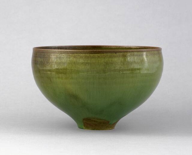 DescriptionBowl has bright apple or kelly green glaze with brown highlights at outside upper edge. Horizontal concentric circle manipulation of clay visible. Near foot is area which did not receive glaze. Smooth, shiny surface.Gallery LabelFleeing their native Vienna as the Nazi forces advanced toward Austria in 1938, the husband and wife ceramicist team of Otto and Gertrud Natzler arrived in America with their potter's wheel, their kiln and little else. The Natzlers' ability to persevere and succeed with little training and few assets fueled what would become a nearly 40-year collaboration that combined Gertrud's elegant and classically formed ceramic vessels with Otto's multifaceted glaze formulations and firing techniques. With less than a year of training, Otto describes the couple's beginning years in their Vienna studio: "Our lack of knowledge went hand in hand with a lack of inhibitions." Their continual experimentation with materials and methods led to these wafer-thin vessels that glow from vibrantly hued glazes with both the smoothness of glass and the roughness of volcanic lava.
