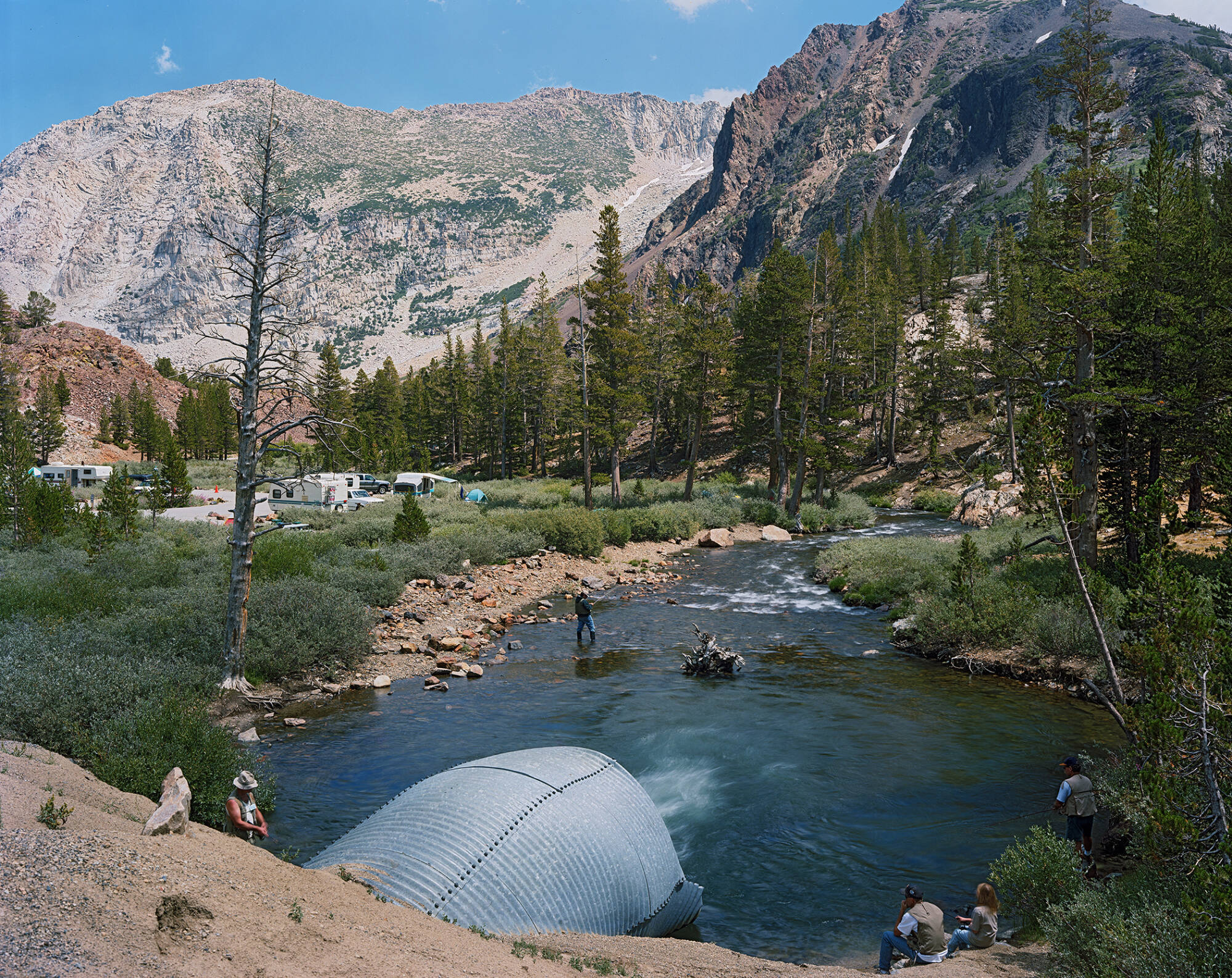 DescriptionImage of several people fishing along a winding body of water that leads to evergreen trees which line the base of a mountain.