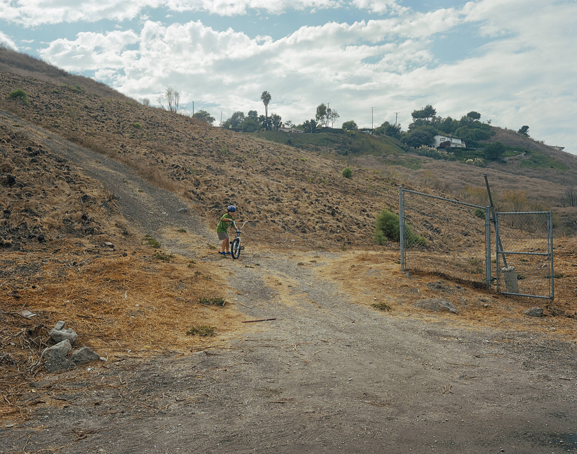 DescriptionImage of a young child standing next to a bicycle at the base of a steep hill next to a section of a chain-link fence. He's wearing a green t-shirt with shorts, sandals, and a blue bike helmet.