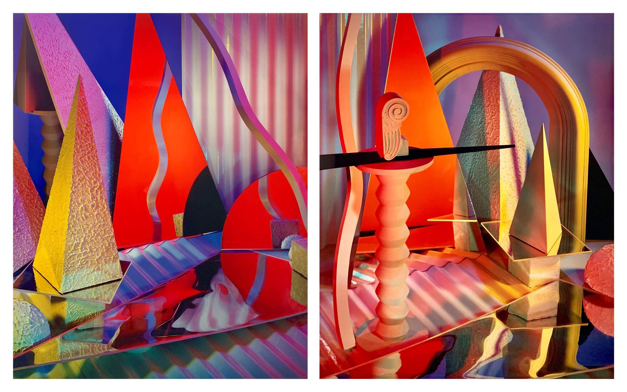 DescriptionDiptych of bright colorful still lifes. Images of elaborate compositions made from various 3-dimensional shapes some of which resemble columns, arches, and cornices. Rigid panels and strips of plexiglass reflect back the bold colors and shapes.CopyrightThis work is copyrighted. Consult copyright information for permission to reproduce.
