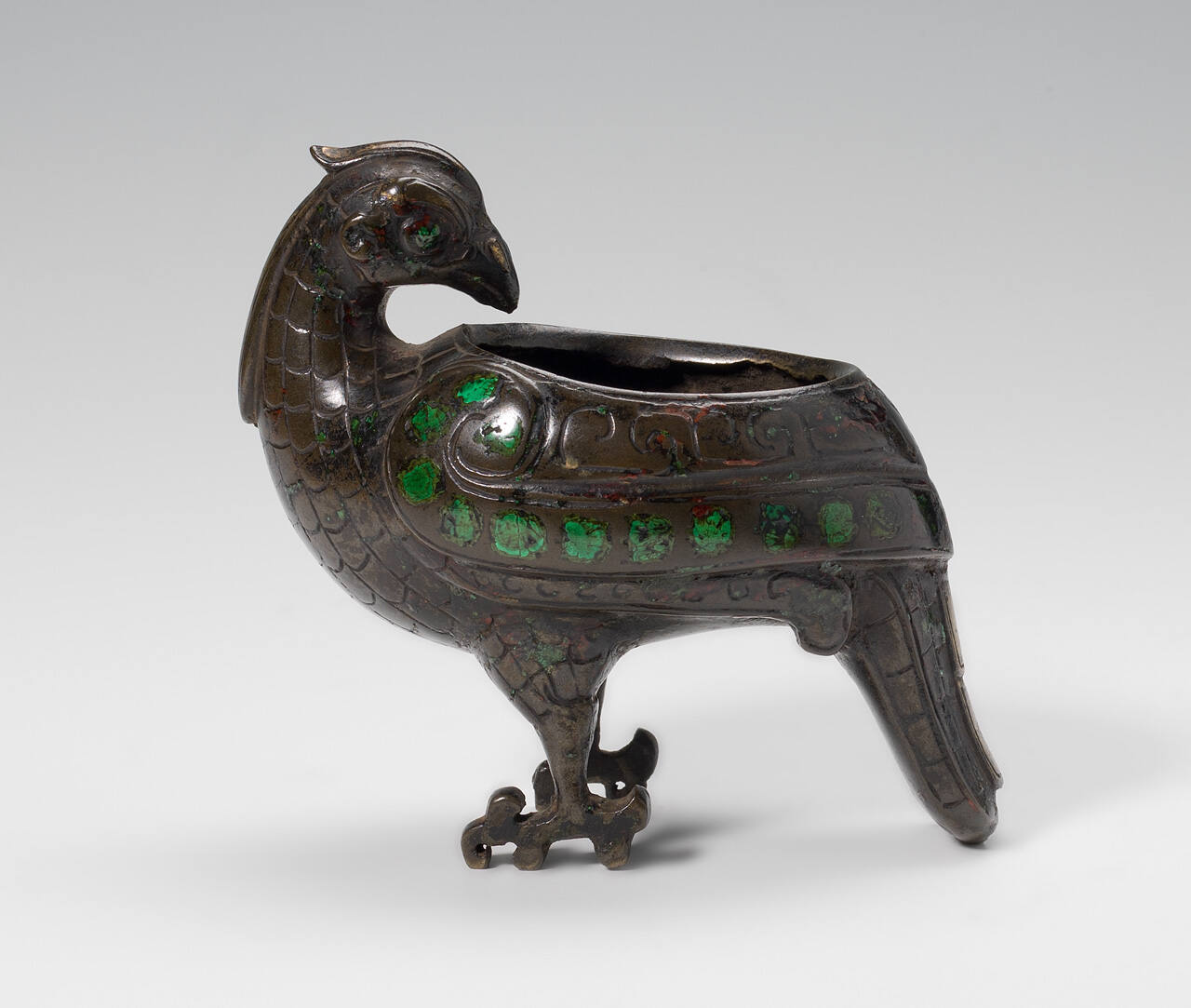 DescriptionIncense burner in the form of a pheasant inlaid with malachite and the crest and tail were gilded. Han style.