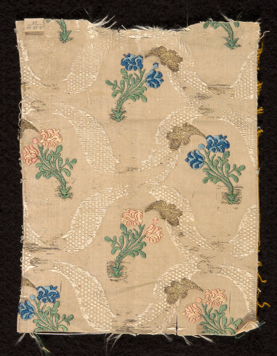 DescriptionCream silk flush patterning brocaded with polychrome silks, silver strip (all missing), silver gilt (frissé)