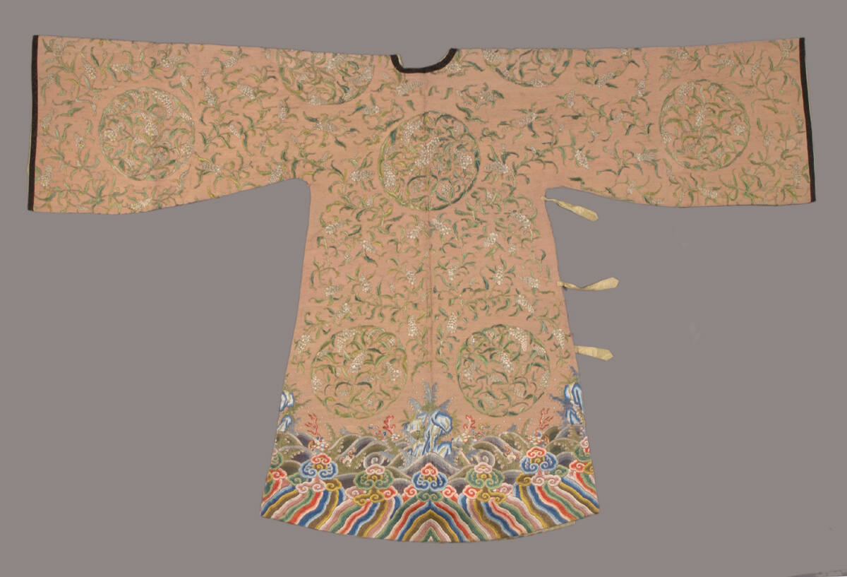 DescriptionCoat couched in yellow thread embroidered in green all-over pattern of flowers and leaves. A theatrical coat from the imperial theater.