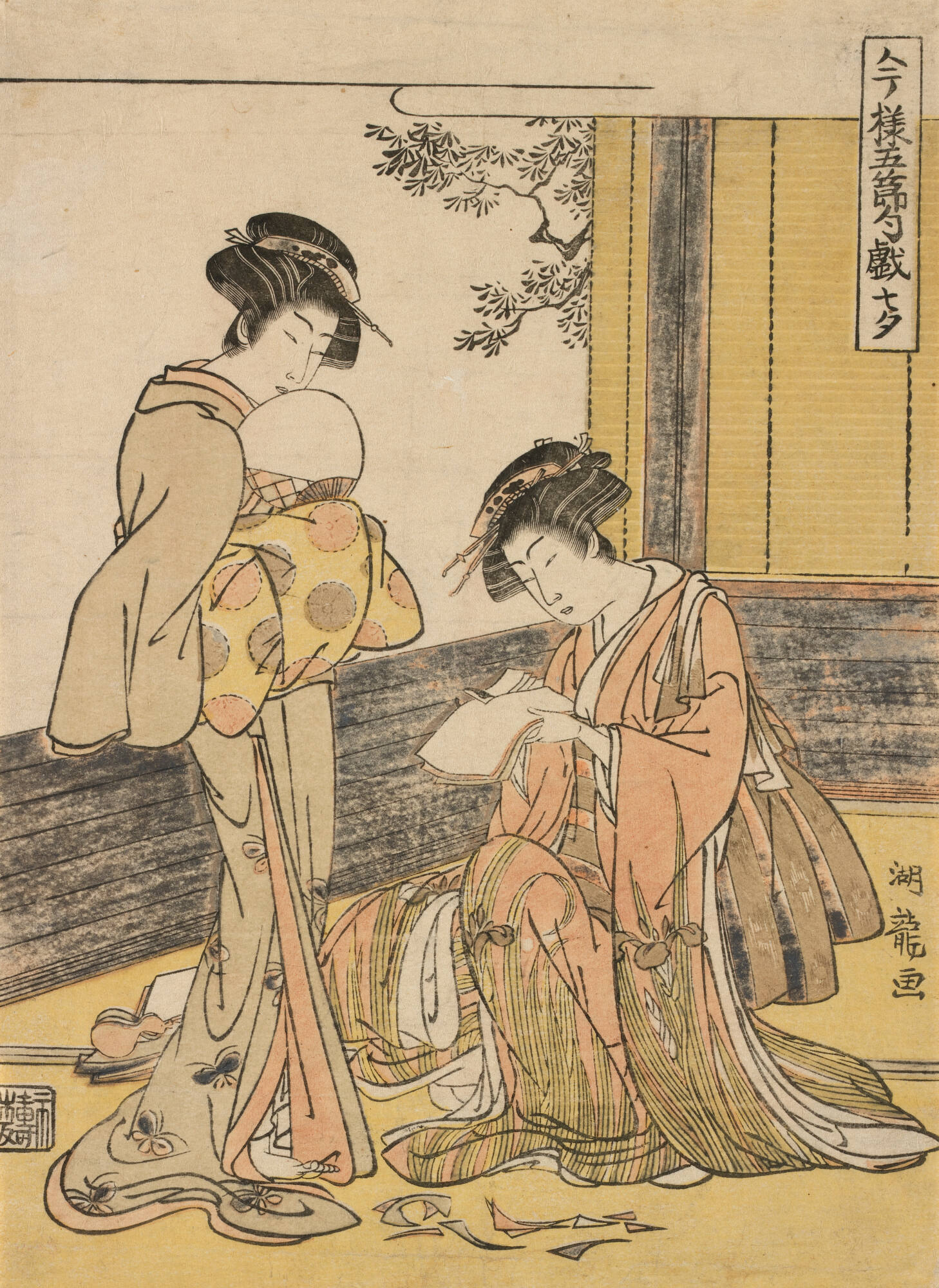 DescriptionWoodblock print portrays two women creating paper decorations for Tanabata on the seventh day of the seventh month.