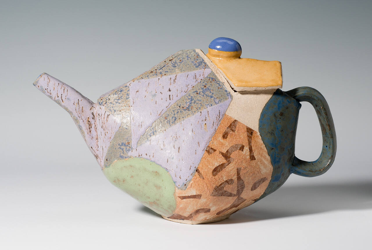 DescriptionSlab-built, irregular convex polyhedral form with horizontal dominant. Blue glazed interior; exterior polychromed in irregular contoured shapes. Handle (at right) and adjacent portion of vessel are blue/green. Spout (opposite at left) is lavender with brown speckling - both running during firing process. Front: two triangular speckled lavender triangles, two triangular and one irregular light blue sections, 1 irregular tan with brown stroke section. Back: one pale green biomorphic form, one irregular tan and brown section, one triangular unglazed section, two triangular and one irregular light blue sections. Lid: gable-like glazed tan with blue egg-shaped knob.Gallery LabelThe form may be familiar, but this teapot challenges conventional expectations of this functional vessel. The jaunty angularity of the pot's top, lid and spout are underscored by blocks of contrasting glazes, which emphasize the physical structure. The rounded body and handle soften the geometry while maintaining the lively palette of overlapping layers of color. John Gill, a graduate of the Kansas City Art Institute, appreciated the school's dual regard for nonconventional ceramics and what he called the "historical traditions of potmaking." Gill was inspired by the brightly hued glazes and complex forms of ancient Persian ceramics.