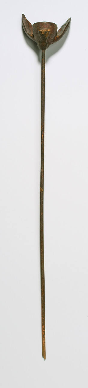 DescriptionThree-petal flower with seed pod, on a straight stem, carved out of wood in a red-brown color.