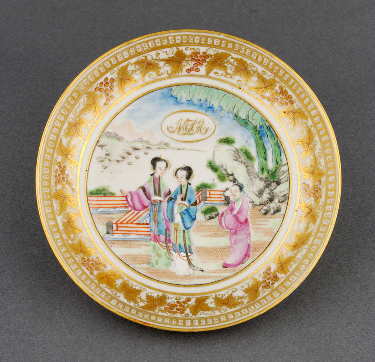 DescriptionPart of 77 piece tea service. In bottom of saucer, on exterior sides of cups is a scene painted in famille-rose style stowing 2 Chinese ladies and attendant in garden. Above figures is gold monogram, MTA (?) in gold oval. On interior sides of all pieces is border design in gold of grape bunches and leaves. On handleless cup on exterior side is also a gold spray of leaves and berries.