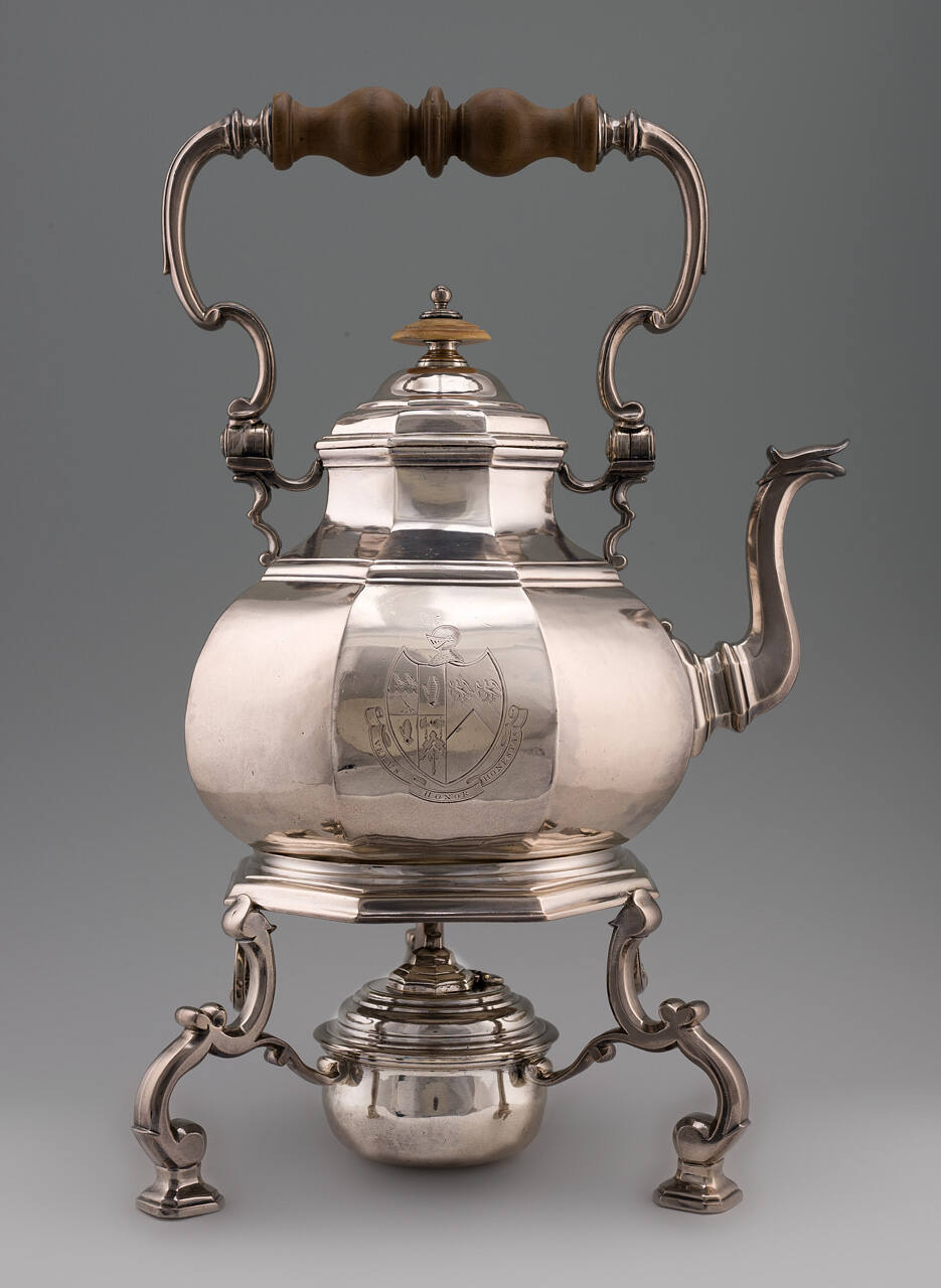 DescriptionBell-shaped octagonal-paneled body with engraved glove and cock crest. Ivory lid finial. Scroll-sided bail handle with turned ebony wood hand piece. Stand has double-C scroll tripod legs, two drop handles, and fitted spitit lamp. All pieces have matching date letters.