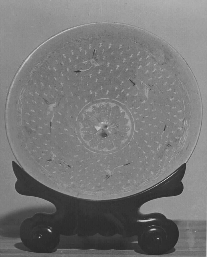 DescriptionGreenish-grey celadon glaze with black and white inlaid design of cranes in fligth and mums on exterior.
