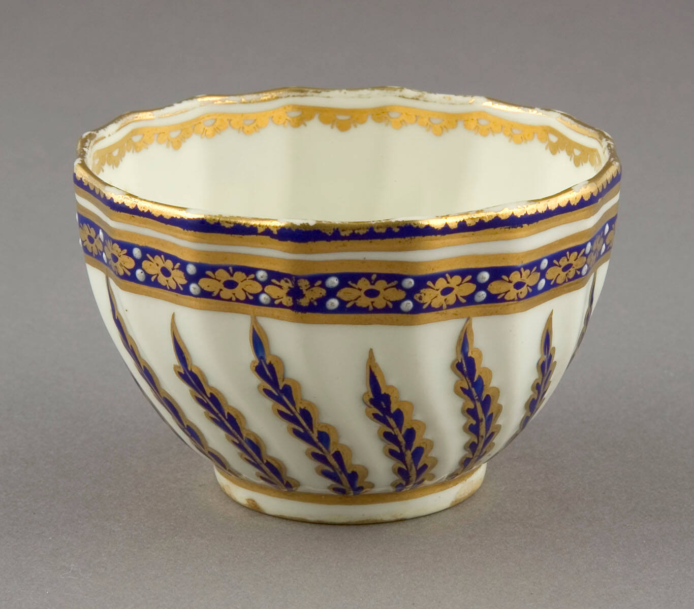 DescriptionHandleless, spirally fluted, with a scalloped rim. Rim is trimmed in a gold pattern with blue underglaze. Each fluted groove bears a simplified leaf form cast in low relief and decorated in gold and underglaze blue.
