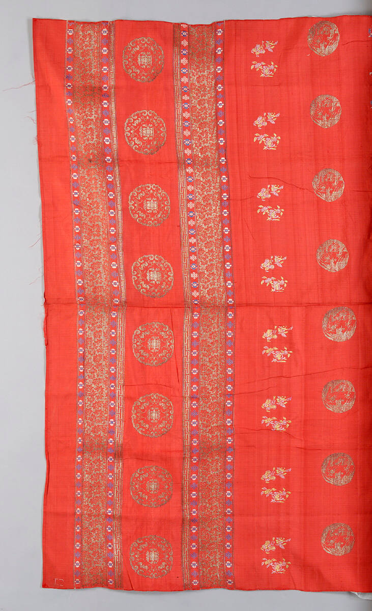 DescriptionVermillion bed cover with circles of gold thread, two decorative bands across the ends. Touches of green and blue.