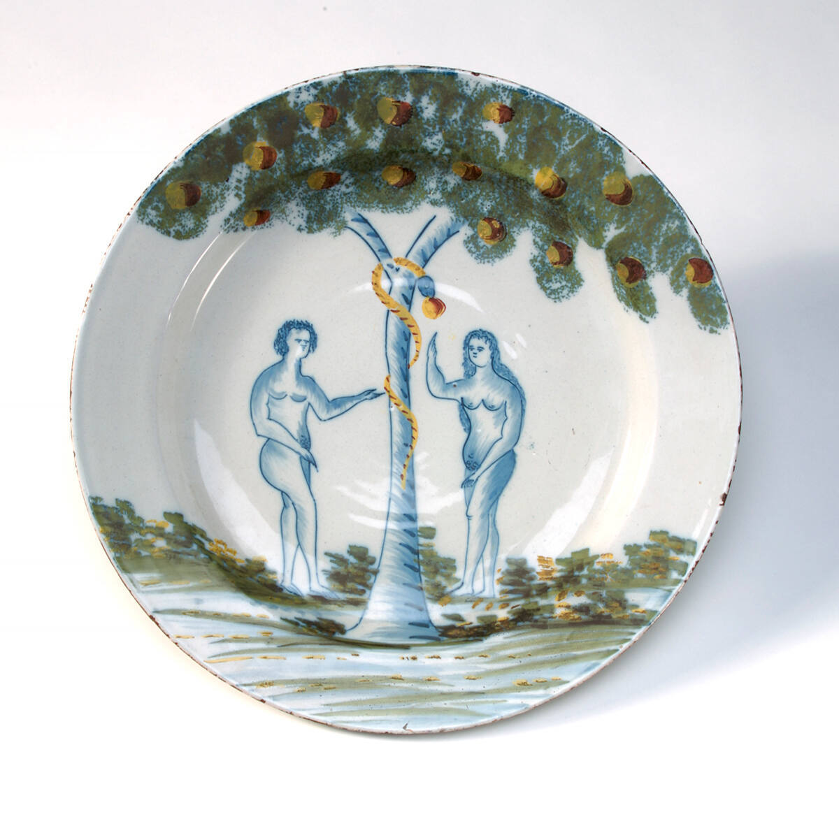 DescriptionDecorated with figures of Adam and Eve flanking a tree. Figures, light blue; serpent, yellow striped with brown, blue head; foliage and ground, matte green flecked with yellow; forbidden fruit, yellow with brown shading.