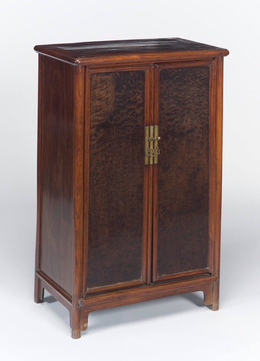DescriptionOne of a pair of sloping stile with single board huamu (possibly nanmu burl) panel doors contained within a huanghuali frame of plain cushion mold section. The typical mitred, mortise and tenon frame top has a two board softwood floating panel contained within a huanghuali frame to the front and sides with a softwood rail to the back. The outside edge of the frame is cushion molded with a square shoulder above and below. The stiles which taper in both side and front elevation are of circular section with a square inner edge. The side boards are of nanmu. The aprons are of plain short-eared design cut from one piece. The interior has considerable traces of lacquer and ramie to the interior and reverse. The inside of one door bears an ink inscription. 17th century.